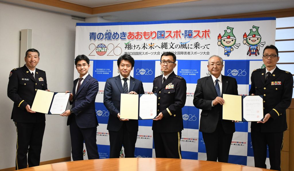 令和7年11月4日(火)、青の煌めきあおもり国スポ(第80回国民スポーツ大会)冬季大会スキー競技会における陸上自衛隊の協力に関する協定締結式及び覚書交換式を行いました。